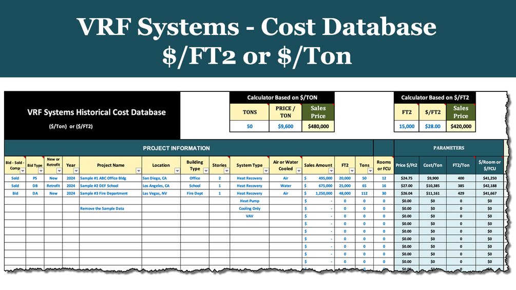 VRF System, HVAC Cost Analysis, Construction Estimation, Cost Database, Cost per Ton, Cost per Square Foot, VRF Systems Template, HVAC Project Planning, Excel Tool.